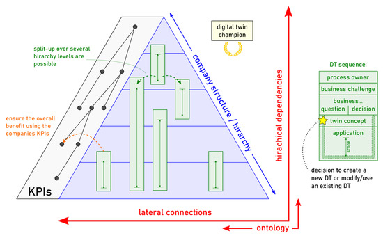 In a service ecosystem comprising several enterprises and a multitude of actors each having jobs to perform and decisions to be taken, usually a multitude of digital twins is required to provide decision support services to these actors. This decision making is structured in a hierarchical way following the structure of the ecosystem. The overall performance metrics can be divided into submetrics for the different hierarchical levels, e.g., a company sets a goal for the annual production output. This goal can be divided into required outputs and delivery times for the different actors in the ecosystem, which may be business units of the same company or from different companies in the ecosystem. This structure is indicated in Figure 4 by the pyramid and the KPI (key performance indicator) tree. The KPI tree includes the main KPIs, as well as the derived basic KPIs and key performance parameters (KPP) on the shop floor level as suggested by [34]. This results in several specific business challenges for different actors on different hierarchy levels, each with specific decision support needs. Depending on the information and data available, a digital twin lends itself for supporting these decisions. This will result in a digital twin landscape over the entire ecosystem with each digital twin serving a specific process owner. The individual digital twin is represented by the vertical boxes labeled “DT sequence” in Figure 4. The digital twin is thereby not limited to the hierarchy level of the process owner. It might reach over several underlying hierarchy levels depending on its scope, as well as on the system topology. A systematic development procedure consisting of six steps for the DT sequence is discussed in [35]. While isolated digital twins might have a significant value-add to the process owners, fostering the full potential requires connecting and integrating all the digital twins. In other words: an isolated twin represents untapped potential. Thus, the digital twins need to be coordinated and integrated across the entire service ecosystem. Doing so enables the prediction of the effects of decisions made on one specific hierarchy level on the performance of the processes of other hierarchy levels or ecosystem actors. This enables decisions to be made not only focusing on the local KPIs but on the overall performance of the ecosystem. Moreover, the coordinated design of the digital twins across the ecosystem draws attention to potential further digital twins that can generate additional benefits and thus close gaps in the overall hierarchical system of digital twins.