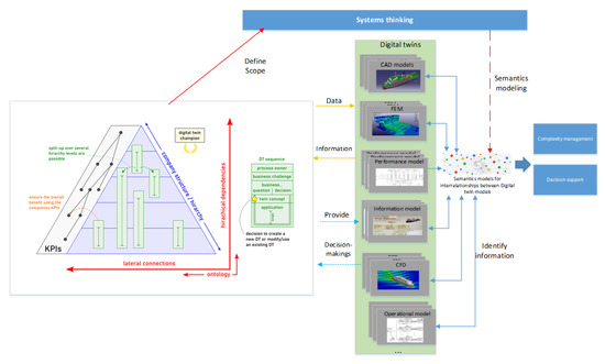 Therefore, referring to the research question formulated in the introduction, we can summarize that the paper provided an answer on how to combine and model multiple types of digital twins in complex industrial service ecosystems in order to create value for decision support. Specifically, the paper described how decision support problems can be broken down to a set of hierarchical questions, which can be translated into a hierarchical architecture of digital twins. The design and the interlinking of these twins are enabled by semantic models based on the concept of the ontology, thus promoting data interoperability in complex industrial service ecosystems. The combination of these twins is specifically targeted at supporting the decision maker’s questions. The approach is effective in the sense that this specific focus on the problem means that it contains only the technical elements necessary for it.