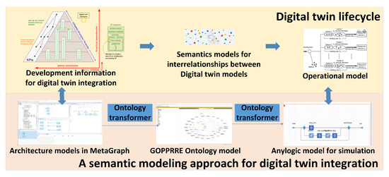 As shown in Figure 6, a real semantic modeling tool chain is proposed to support digital twin integration across the product lifecycle. An architecture modeling tool MetaGraph 2.0 is used to develop architecture models for managing the complexity of the digital twins using a model-based systems engineering approach [43]. Through different models, architectural views of different digital twins are described using KARMA language. Then through the GOPPRRE (Graph-object-relationship-role-point-property) ontology transformer, a GOPPRRE ontology model is generated. Then a model in the software suite AnyLogic is generated from the ontology model using a model transformer. Through this approach, the complexity of digital twins is formalized through a unified formalism and simulation models can be implemented automatically through ontology models.