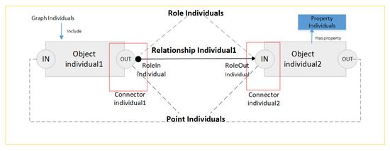 The GOPPRRE ontology refers to a unified MBSE (model-based systems engineering) ontology based on a basic MBSE formalism developed in [43]. The ontology entities and their topology were developed based on a M0-M3 modeling framework whose class and object properties are shown in Table 1. The ontology entity enables the representation of a model structure as shown in Figure 7. From the model topology, the graph individual is defined as a model to represent model compositions and the connections between them. Within one graph individual (model structure), object individuals are defined to represent model compositions. Relationship individuals are defined to represent connections between object individuals. Each relationship individual has two role individuals representing the two ends of the relationship individual. The point individuals are defined as the port for each object individual. In order to formalize the connection between object individual1 and object individual2 through relationship individual1, two connector individuals are defined to bind role individual, relationship relationship individual, and point individual. All the non-property individuals have their own property individuals to define their attributes.