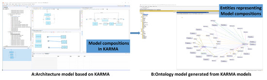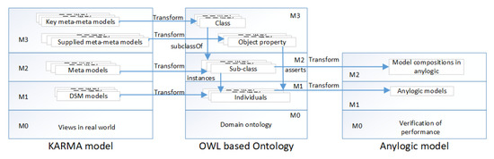 In order to realize the integration of architecture models and verification models, a model transformer was developed to transform architecture models based on KARMA language to AnyLogic models based on XML. Through this model transformation based on the GOPPRRE ontology, architecture models are transformed to AnyLogic models for verifying the performance of the process twin automatically as shown in Figure 8. In this paper, KARMA language is used to develop thearchitecture model for system architecture development as shown in Figure 9A. Through the GOPPRRE ontology generator, the GOPPRRE ontology model (Figure 9B) is generated from the architecture models.