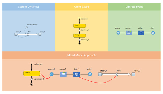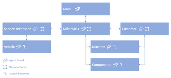 Figure 11 depicts the model structure and the nesting of the different agents. Furthermore, the different simulation methods used in the different actors are indicated. This structure links the hierarchical concept shown in Figure 4 and the mixed model approach, since some elements of the simulation would also work on their own. By integrating these elements, more complex questions can be answered.