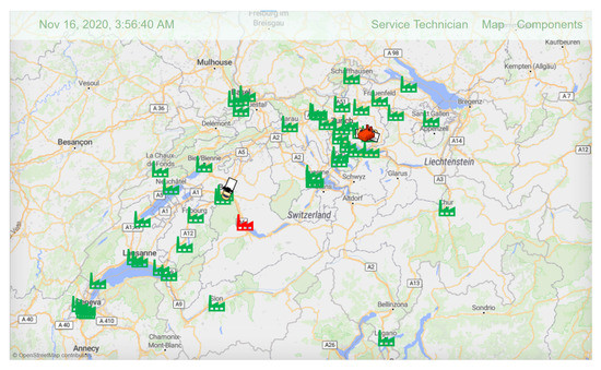 Based on the simulation results, the model suggests different alternative actions. Based on this decision support, the decision maker can now plan the response in the real world in combination with its wealth of experience. Simulating those different strategic scenarios, it becomes possible to understand the consequences of different service operations decisions. Moreover, it allows certain decisions to be tested inside a safe environment. Furthermore, it becomes possible to understand the financial impacts of improvements of algorithms in error detection and different outcomes of strategies for spare part handling concerning bottlenecks or overproduction. Finally, it is also possible to adjust the number of service technicians and their training and simulate the resulting changes to the ecosystem. Figure 12 shows the model with the GIS environment including the customers, the service technicians, and MillerMills. It should also be possible to answer operational questions triggered by operator triggers in the future. For this purpose, the process twin must be enabled to analyze near-realtime data and calculate results.