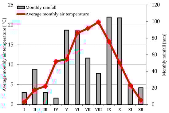 Total annual precipitation in 2020 was 605.1 mm, while average total rainfall during the growing period (April to September) was 385.2 mm (Figure 1). The average annual temperature was 10.1 °C, and for the April-September period it was 16.0 °C.