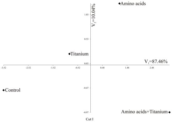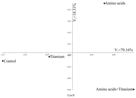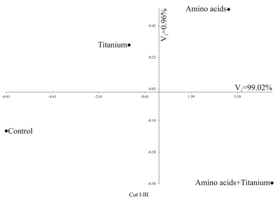 In cut III the greatest similarity (1.944) was observed between the effects of amino acids and amino acids + Ti, but the largest distance (8.594) between control and amino acids + Ti (Table 4, Figure 2). For all three cuts jointly the Mahalanobis distance ranged from 2.175 (between amino acids and amino acids + Ti) to 11.491 (between control and amino acids + Ti).