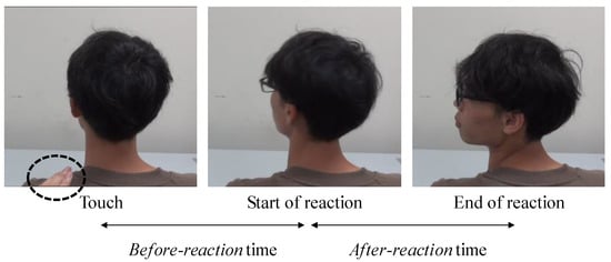 One aspect of future work is to consider appropriate reaction timing and behavior for affective touch because past studies have reported the effects of affective context upon reaction time [,]. The reason why we did not deal with such affective touch in this study is because we wanted to find a basic reaction time as a baseline. Using different reaction timing to the baseline timing would be a useful way to judge appropriate reactions to affective touch. Factors such as affective touch interaction, touch parts (e.g., head or hand) [], strength (perceived pain) [], and frequency would influence appropriate reaction timing. Past studies have shown that these touch characteristics would change based on conveyed emotions via touches [,,]. In this study, we used a gentle touch on the left shoulder. If the touch part is different (head or hand), the appropriate time will obviously also be different due to conveyed emotions. In addition, if a person violently touches the models, they should react more quickly and exhibit a different attitude.