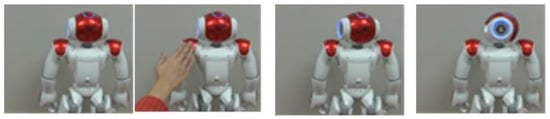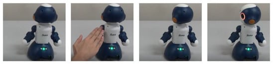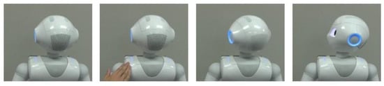 Next, we discuss the possibility of making robots autonomous. Pepper and Nao have several touch sensors in their heads and hands. Such sensors do not cover their shoulders. Sota has no touch sensors. Therefore, attaching touch sensors to these robots would be necessary to enable them to react to touch behaviors autonomously. We propose that a capacitive sensor would be useful for this purpose. Several researchers have developed wearable touch sensors by using multiple capacitive sensors for robots [,,]. Such capacitive sensors can roughly estimate the distance between the sensors and human body parts like a hand by observing the differences of time-series data. Therefore, attaching this type of sensor to a robot’s body enables them to react toward touch behaviors.