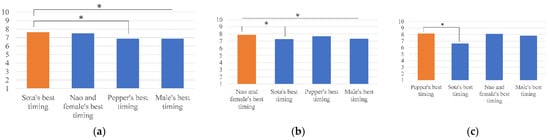 Comparison with other best combination timing for Sota, Nao and Pepper. (a) naturalness of Sota, (b) naturalness of Nao, (c) naturalness of Pepper. * p < 0.1.