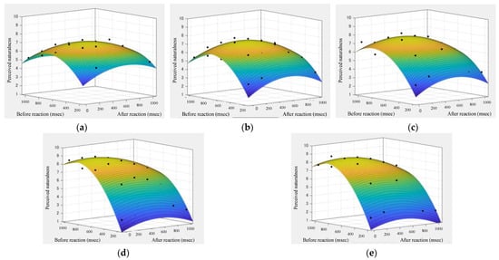We analyzed the collected data by surface fitting with a polynomial spline (Equation (1), Before is the before-reaction time value, and After is the after-reaction time value). We used the Akaike Information Criterion (AIC) to adjust each model’s likelihood. Figure 8 and Table 6, Table 7, Table 8, Table 9 and Table 10 shows surface fitting results with the averaged data points of the naturalness of each combination and the parameters. As shown in the figures, the slope changes depending on the model. The figures also showed that the peak values shift toward slower after-reaction time by comparing Sota, Nao, Pepper and Human.