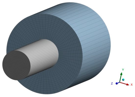 For each of the above joints, the pressing process was modeled using the Finite Element Method (FEM) and the Ansys v. 19.1 calculation system. The discussed set has an axis of symmetry, therefore it seems advantageous to use an axisymmetric model in the analysis. Initially, the authors prepared such a model, however, it was found that ANSYS simulation of interference using axial-symmetry led to errors that prevented effective completion of the analysis. Therefore, an axisymmetric model was abandoned in the numerical analysis. Figure 3 shows the discrete model of the shaft and the hub in the initial configuration. The model was divided with the use of solid hexagonal finite elements SOLID 186 [18]. The mesh of nodes was densified towards the contact surface. The model has 61,440 elements and 262,161 nodes. The FEM model used a bi-linear material model, with a tangent modulus of 1450 MPa.