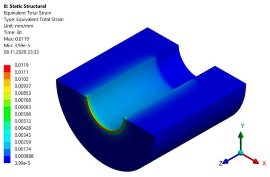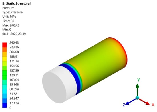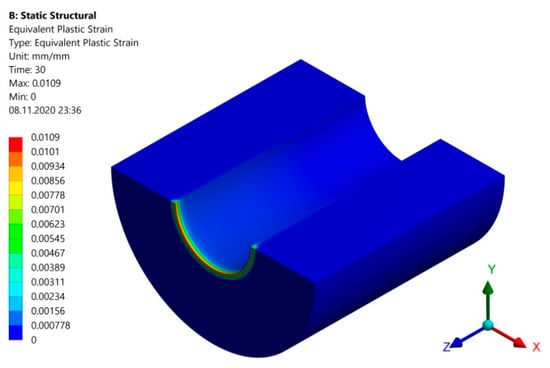 Figure 7 shows the distribution of surface pressure on the shaft. The maximum value of the pressure is greater than the value corresponding to the material yield point, which causes plastic strain on the contact surface shown in Figure 8. A similar phenomenon is observed in the pressing analysis in joints no. 3 to 15, while joints no. 1 and 2 occur in the elastic range.