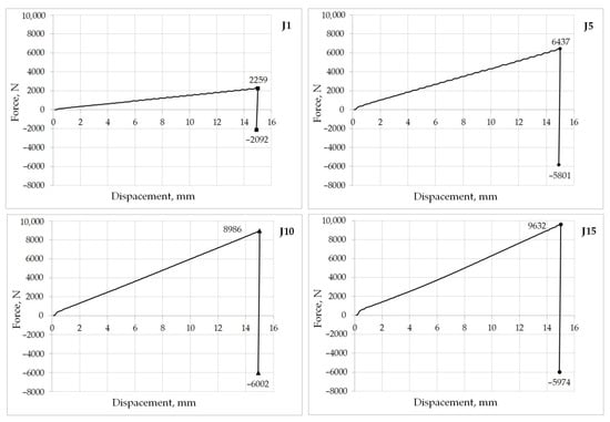 To verify the correctness of the numerical model, experimental tests were carried out to determine the breaking force for the J5 joint. The results from Table 4 are presented in Figure 11.