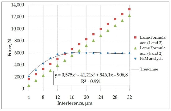 Figure 11 shows graphs of the dependence of load-bearing force of the joint from the interference value for a constant diameter of the hub opening of ø 8 mm with a joint length of 15 mm. The results of the numerical simulation were approximated by the graph of a third-degree curve described by the following function: 0.575x3 − 41.21x2 + 946.1x − 906.8.
