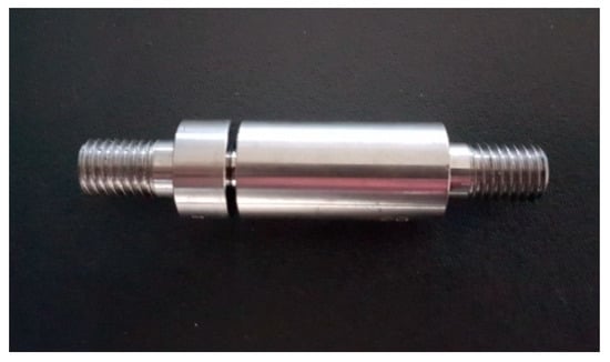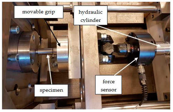 Each set was subjected to a joint axial disassembly force test performed on a measuring device consisting of an MTS class 0.5 actuator equipped with a force sensor measuring the force range up to 25 kN and a displacement sensor with a range of up to 75 mm. The author′s procedure, developed in the TestSuit program controlling measuring system, was applied. An appropriate mounting adapter was used to fix the assembly, as shown in Figure 13.