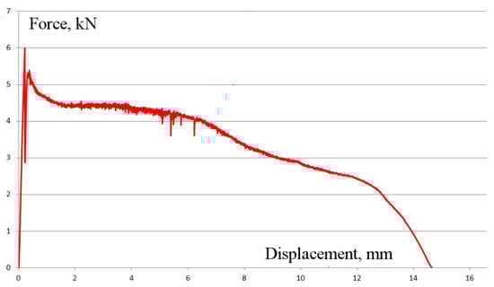 Five breaking tests were carried out, recording the force and displacement values in each test until the shaft was completely withdrawn from the hub. An example of the graph obtained during one of the tests is shown in Figure 14.
