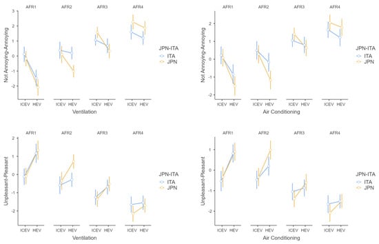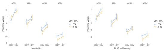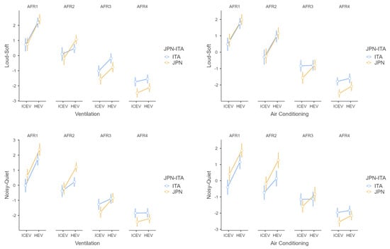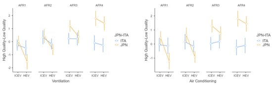 For the Aesthetic dimension, the listening test results for the adjective couples of High Quality-Low Quality, Not Annoying-Annoying, and Unpleasant-Pleasant highlighted that the most relevant difference between the two Subject Groups occurred for High Quality-Low Quality. More specifically, the Japanese considered the quality of sounds to be significantly lower than Italians in both ICEVs and HEVs and whether the AC was turned on or off, but only at the highest air flow rates. The Not Annoying-Annoying item was found to be affected mainly by the airflow rates and the engine type, with ICEVs considered more annoying than HEVs, especially at low AFRs. Moreover, both the airflow rate and the type of engine showed interaction effects with the subject group in the Ventilation condition, with Japanese considering ICEVs more annoying. This interaction effect disappeared when the air conditioning was turned on. Furthermore, the results for “Unpleasant-Pleasant” also showed the main effects of the air flow rates and the engine type in influencing the evaluations. The higher the air flow rate, the more unpleasant the judgements. Both groups considered HEVs more pleasant.