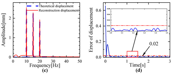 The error diagram of reconstructed and locally amplified displacement signals in the interval of 1–1.5 s is exhibited in Figure 4d. The error between reconstructed and locally amplified displacement signals was large at 0.2 s and then dropped fast to 0.02, proving the validity of the improved algorithm. The value of the error is related to the selection of target frequency and the precision coefficient, and the maximum value of error is shown in Table 1 by changing these two parameters. It was found that the better precision was obtained until 1 Hz.