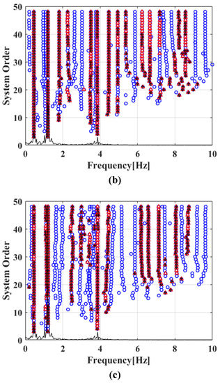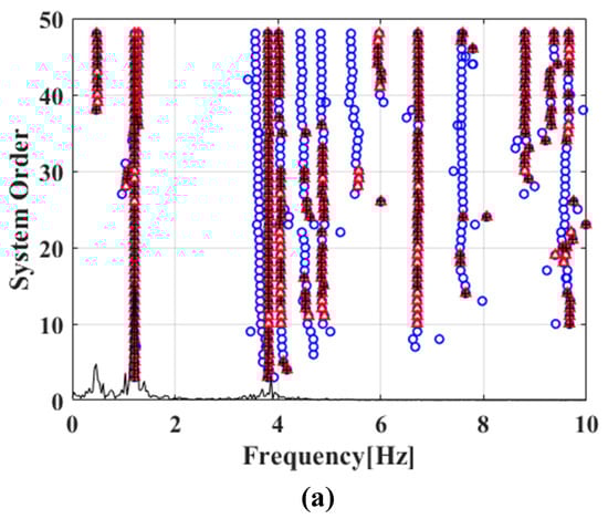 The modal parameters of the system were identified by calculated accelerations and reconstructed displacements. The frequencies, modals, and damping ratios of the system were identified by its stability diagrams. The x- and y-axes of the stability diagrams shown in Figure 10 represent the frequencies and mode orders of the system, respectively. When the difference between the characteristics of high and low orders was within a certain tolerance range, a stable mode appeared. The tolerances for the frequency, the damping ratio, and the modal shape were set to 1%, 5%, and 5% respectively, and the number of Hankel matrices was c × (n − c + 1), where c = 500 and n is the data length, and the order of the state space model ranged from 2 to 50. Moreover, the appropriate window size was 10 s and the corresponding sliding step was 5 s to satisfy 50% duplication of time-domain signals between adjacent windows.