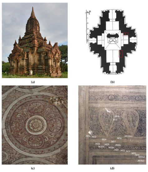 (a) Me-taw-ya temple (1205); (b) Me-taw-ya map by Pichard inventory with XRF investigated areas; (c) interior, detail of the circle pattern with lotus rosacea motif; (d) Eastern vestibule, north-east wall, detail of XRF investigated areas.