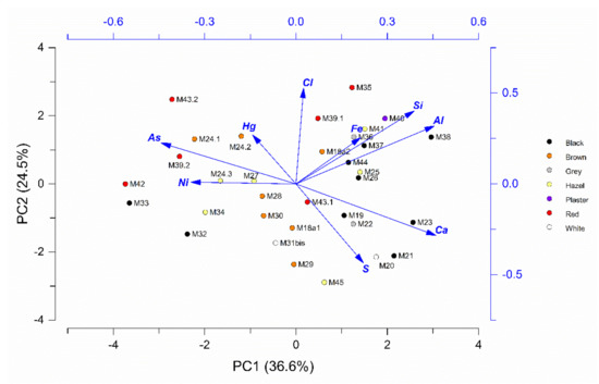 PCA biplot on the net area under the X-ray characteristic peaks of the main elements composing the paint layers.