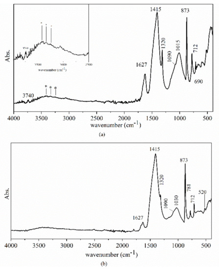 ATR-FTIR analysis indicated the presence of calcium carbonate, silicates and quartz. In all samples, the presence of weddellite and sometimes whewellite were found. In sample MY49 only quartz and kaolin, with typical Si-O and O-H stretching modes at 1033 cm−1 and between 3700–3500 cm−1, respectively [36], were detected. Whewellite (Figure 4a), identified by its characteristic bands at 1320, 1627 cm−1 ascribable to the νs (C-O) + δ(O-C=O) and νa (C=O) vibrational modes, respectively, and the pattern in the OH stretching vibrations (3600–3000 cm−1) [37,38], suggested the use of an organic binder mixed with the lime. A work by Cariati et al. [39] has considered the possibility that calcium oxalate found on the stone artefacts had been formed after the oxidation of organic substances applied on the stone’s surfaces. In MY33 and MY44a, the presence of illite was revealed by the Si-O stretching modes at 1015 cm−1 and 1090 cm−1, this one as shoulder and the Si-O bending out of the plane at 690 cm−1 [40] (Figure 4a). Smectite was found in samples MY45 and MY45e thanks to the intense Si-O stretching modes at 1030 cm−1 with a shoulder at 1090 cm−1 and the Si-O-Al bending mode at 520 cm−1 [36] (Figure 4b).