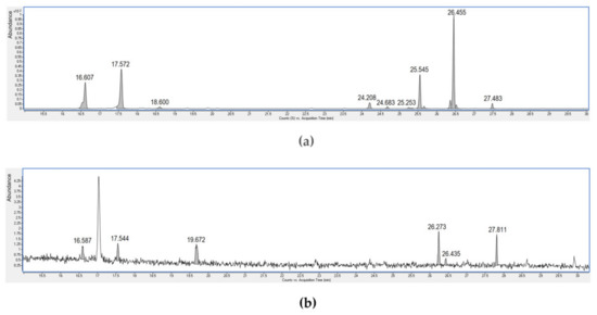 The percentages of monosaccharides determined in the reference gums are shown in Table 2: in the acacia gums (G1 and G2) arabinose, galactose, mannose, fucose, xylose and glucuronic acid were detected. Conversely, in the chromatogram of Neem gum (Figure 5a) arabinose, galactose, mannose and glucuronic acid were revealed, whereas peaks related to fucose and xylose are missing.