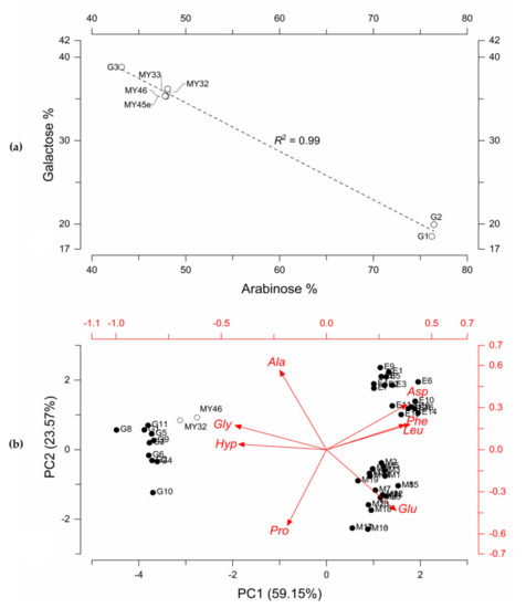 (a) Arabinose vs galactose bivariate plot; (b) PCA biplot on the various possible proteinaceous binding mediums references and the samples MY46 and MY32. G1: C; G2: CYO; G3: CRO; G4: CVB; G5: CSJW; G6: CGE; G7: CSM; G8: AzCpi; G9: AzCpv; G10: Cpv10; G11: GI; M1: L; M2: LYO; M3: LRO; M4: LVB; M5: LSJW; M6: LGE; M7: LSM; M8: AzLtv; M9: Ltv (uv); M10: BpLti10P; M11: TvLtv; M12: TvLtv©; M13: BpLtv(uv); M14: AzLti; M15: AzLtv; M16: BpLti10P; M17: TvLtv; M18: Ltvi23; M19: BpLti©; M20: BpLtv(uv); M21: BpLtv©; M22: TvLtv©; M23: Ltv(uv); E1: U; E2: UYO; E3: URO; E4: UVB; E5USJW; E6: UGE; E7: USM; E8: SmUivi; E9: TvUivg; E10: AzUig; E11: AzUivi; E12: MnTgi; E13: MnTgv; E14: BpUig; E15: BpUivi; E16: Uivg.