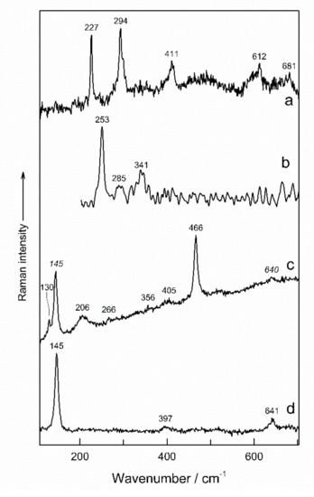 Sample My33: Raman spectra of (a) hematite; (b) vermilion; (c) quartz (the italic bands are from anatase); (d) anatase.