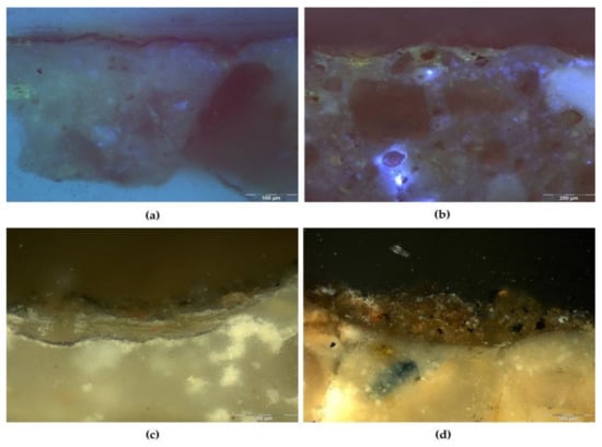 Micrograph of the painting layer: (a) sample MY44 and (b) sample MY33 in UV light; (c) sample MY33; (d) sample MY45e in visible light.