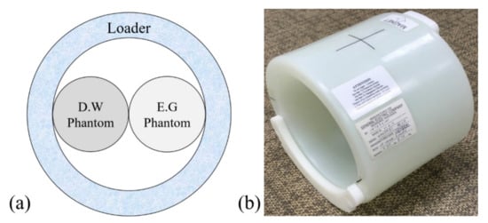 (a) Configuration of the distilled water and ethylene glycol phantoms and (b) conventional head loader. Distilled water and ethylene glycol phantoms were placed side by side at the center of inside the conventional head loader.