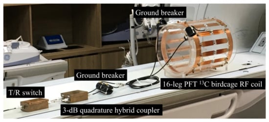 Installed configuration of PFT 13C birdcage RF coil with CPSCs, ground breakers, 3 dB quadrature hybrid coupler, and T/R switch in a 3.0 T MRI system.