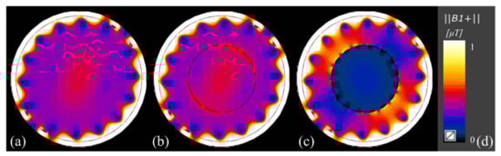 For the FDTD EM simulation of case 2, the CPSCs were modeled as open circuits. The input power was normalized to 1 W. uniformity maps were calculated for cases 1 to 3 in the ROI using percent image uniformity (PIU), which can be calculated as Equation (5) []. All FDTD EM simulations are performed using Sim4Life (ZMT, Zurich MedTech AG, Zurich, Switzerland). The expression is as follows: