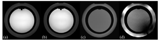 In this study, all MR experiments were performed using a 3.0 T MRI scanner (GE Healthcare, MR750, Milwaukee, WI, USA) in Chonnam National University hospital. The performance of CPSCs was evaluated using PIU measurements of American College of Radiology (ACR) methods [] with a 204 mm outer-diameter, 165 mm length, and mixture of chemical compounds []. The 1H MR experiments using ACR phantom were performed using a high-performance 1H body RF coil for transmission and reception for three cases as follows: