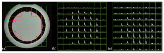 Figure 6 demonstrates the 13C MR spectra of the corn-oil phantom. Figure 6a is a 1H T2-weighted reference image with an 8 × 8 13C spectral grid, which was the result in Section 3.3. The SNR for both case 1 and 2 was calculated at the selected 13C spectral grid, which is described as a red broken line in Figure 6a. Figure 6b,c are the 13C MR spectra of corn-oil phantom, which is surrounded by a 16-leg low-pass PFT 13C birdcage RF coil with CPSCs and a 16-leg low-pass 13C birdcage RF coil without CPSCs, respectively, corresponding to the 8 × 8 13C spectral grid in Figure 6a. Table 4 lists the SNR and the standard deviation of the corn-oil phantom at the selected 13C spectral grid. The SNR of the selected 13C spectral grid in case 1 and case 2 was 33.80 and 35.76, respectively. There was a 5.5% of SNR drop in Figure 6b compared with Figure 6c.