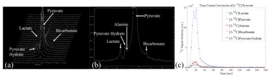 In the prescan step, the flip angle was calibrated to 90° using a PFT 13C birdcage RF coil with distilled water and ethylene glycol phantoms in a 3.0 T MRI system, as discussed in Section 2.6. Figure 7a–c present the slab dynamic 13C MRS results of the [1-13C] compounds. In slab dynamic 13C MR spectra, [1-13C] pyruvate, [1-13C] lactate, [1-13C] bicarbonate, and [1-13C] pyruvate hydrate were demonstrated for 180 s.