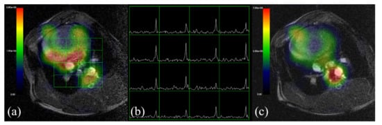 Figure 8a–c present the 3D swine cardiac 13C MRSI results. Throughout the 3D swine cardiac 13C MRSI, [1-13C] pyruvate and [1-13C] lactate signals were acquired and co-registered with swine cardiac 1H MR images to investigate the [1-13C] metabolism.