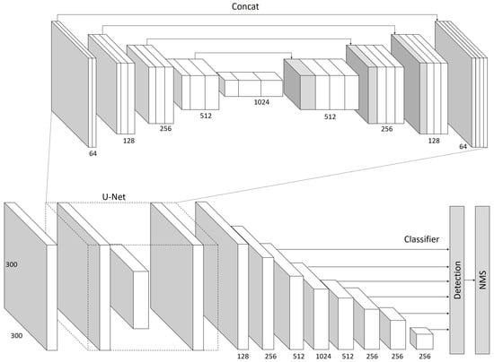 Liu et al. proposed SSD [27] and a one-stage deep neural network for end-to-end object detection, where the output space of the bounding boxes was discretized into default boxes according to the different feature map positions of different scales and different aspect ratios. In the prediction stage, the network obtains the probability of the existence of each object category in each default box, as well as the box that best matches the object shape. The SSD network can detect objects of different sizes more effectively by combining multiple feature maps of different resolutions. Moreover, SSD does not need to generate proposals, pixels, or feature re-sampling stages, but encapsulates all calculations within a network, thus, SSDs have good accuracy even when the input image size is small. The main network structure of SSD is VGG16 [35], which replaces two full-connection layers with the convolution layer and adds four convolution layer network structures. Regarding the feature maps output by the five different convolution layers, the convolution layers of two 3 × 3 convolution kernels are used to process them separately. One of the convolution layers outputs the confidence for classification, and each default box generates an N + 1 confidence value. The other convolutional layer outputs regression localization. Thus, SSD is highly accurate in real-time object detection and highly flexible in a network architecture. Therefore, this paper chose this architecture as the core, replaced VGG16 with U-Net, and the edge information was merged and retained through the autoencoder feature.