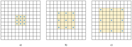This paper added dilated convolution to Conv13 and Conv14, as shown in Figure 2. Dilated convolution increases the perceived field of convolution without reducing the spatial feature resolution or increasing model and parameter complexity, meaning it compensates for the lost feature information in the first half and adds more global information to the feature map. Figure 3 shows the difference between ordinary convolution and dilated convolution. The blue dots represent the 3 × 3 convolution kernel, and the yellow area represents the perceived field of vision after the convolution operation. Figure 3a shows the general convolution process, which is preset to 1 and performs the sliding operation closely on the feature map. Figure 3b shows that the dilated convolution is 2, and the perceived field of vision is 5 × 5. Figure 3c shows that the dilated convolution is 3, and the perceived field of vision is 7 × 7. Figure 3 shows that the benefit of dilated convolution is that without pooling loss information, the perceived field of vision is enlarged and each convolutional output contains a wide range of information. In this paper, the values of dilated convolution added to Conv13 and Conv14 were 6 and 5, respectively.