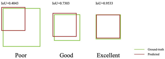 As it can calculate the overlap range between the predicted target and the ground-truth target, Intersection over Union (IoU) is one of the basic measurement standards for object detection. When the overlap area is larger, the IoU value is higher, which indicates a more accurate prediction, as shown in Figure 5. As it is actually quite a strict index, the results will be relatively poor if there is a slight deviation. In general, good prediction results can be obtained if the IoU is greater than 0.5.