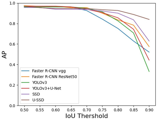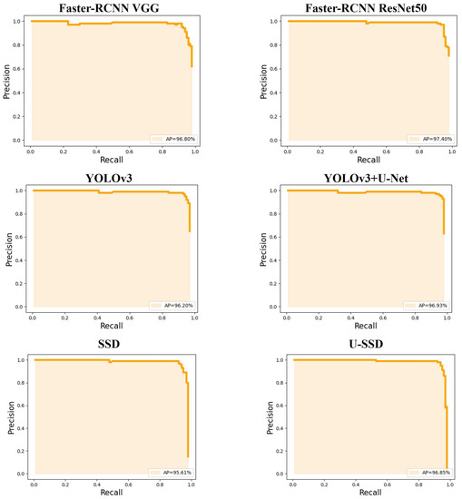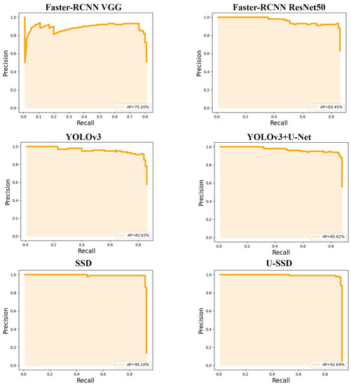Due to the large difference between the Table and the natural object, the higher the overlap rate between the predicted position and the real position, the better. Therefore, the results of the model under IoU = 0.8 are quite important, as shown in Table 3. The one-stage model performed better than the two-stage model in precision, recall, F1-score, and AP. The U-SSD model, as proposed in this paper, performed better than the other models in comprehensive comparison. The Precision-Recall Curve is shown in Figure 7.