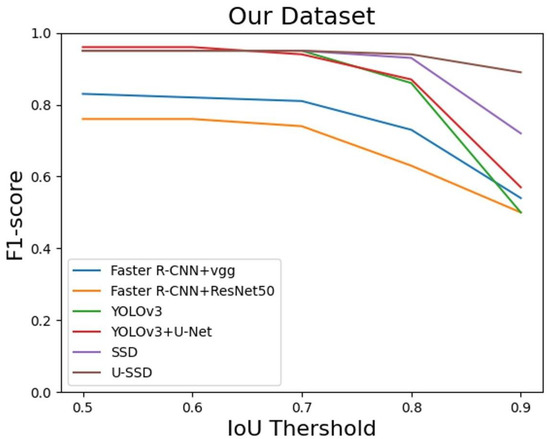 The two-stage model consumed more time in detection speed than the one-stage model. Table 7 shows the detection time of different models. It can be seen that the detection time of models based on Faster R-CNN was longer than that of models based on YOLOv3 and SSD. Although the detection time of YOLOv3+ U-Net and U-SSD were increased by adding U-Net to the original model, compared with Faster R-CNN, it still had a higher detection speed.