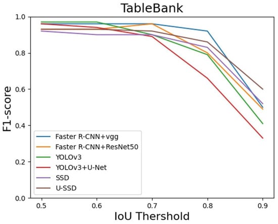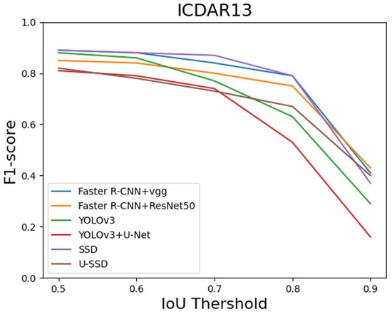 The layout of documents will vary according to the editor’s style. The layout of public datasets are mostly composed of text areas, tables, or pictures, among which the styles of ICDAR2013 are more diverse, while the data of this study mostly consist of large object tables and a few text areas, similar to TableBank and Github. Therefore, the detection results of ICDAR13 were slightly poorer than those of the other three datasets, as shown in Table 5. Although the validation results of the proposed model in public datasets show that there was no significant effect at the IoU threshold of 0.7, there was little difference between the models. When IoU was 0.9, the F1-score of each model decreased significantly, and as the IoU threshold increased, the detection performance decreased. Thus, it is very important for the table to predict as little position offset as possible and as accurately as possible. Our model was almost higher than the other five models when the IoU was 0.9, and the average IoU was quite close to the optimal result. As can be seen from Figure 9, Figure 10, Figure 11 and Figure 12, U-SSD (brown line) has a lower decline than the other five models, and this result illustrates that the stability and model detection performance of U-SSD are very good, and the network architecture based on SSD shows good performance.