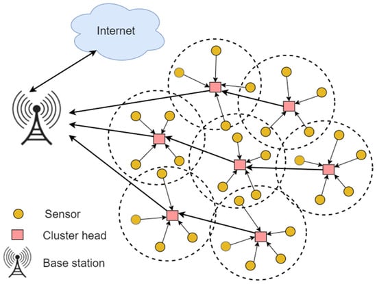 In WSNs, clustering effectively manages network problems related to service life and energy use [18,19]. Clustering ensures energy conservation by adopting low-cost communication techniques [20] when it divides the network into different groups of nodes, called clusters. Each cluster has a CH that oversees the activities of the other nodes in the cluster [21]. The CHs can also reach the BS by creating a group and communicating with the BS in a multi-hop pattern. The CH first gathers the data collected by all the nodes before forwarding them to the BS [22]. The schematic of a clustered network in a WSN is shown in Figure 2. The designation of CHs in the clusters removes the problem of redundancy and reduces network energy consumption [23]. Different clustering techniques depend on various procedures and methods when executing clustering activities [24,25].
