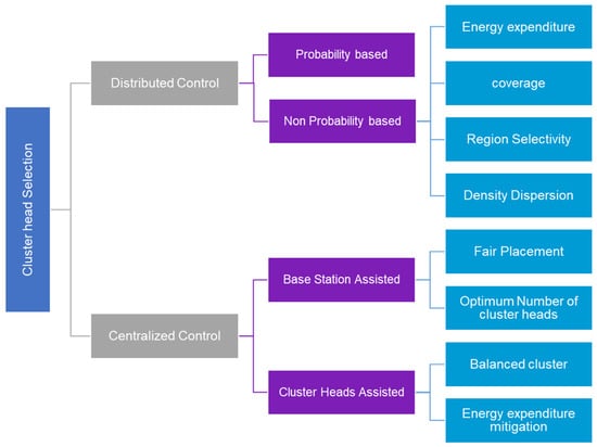 Cluster head selection is the first phase of most clustering schemes, as the CHs are the gateway between the SNs and the BS. The role of the CH is to mediate communication between the SNs and the BS; hence, CH selection is a significant process for the subsequent clustering procedures to improve energy efficiency and lifespan of the network. Many studies have considered optimizing the CH selection process by implementing different techniques. These techniques are classified into self-organized schemes (distributed control) and assisted schemes (centralized control). Each SN in the self-organized scheme can execute its algorithm and decide on becoming the CH. By comparison, in the assisted scheme, the nodes are grouped by centralized authorities before selecting the CH for each cluster. Furthermore, self-organized schemes can be grouped into probability and non-probability-based schemes, while assisted schemes can be grouped into BS-based and CH-assisted schemes. The entire CH selection process is represented in Figure 6.