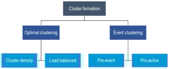 This phase begins with advertisement messages sent out by the newly elected CHs to announce their new status and ends with the join message sent by each node to its optimum CH. The cluster formation schemes are categorized into event-driven and optimal clustering schemes. Optimal clustering schemes strive to either manipulate the cluster size based on the application type and data transmission, or to balance and reduce energy usage by considering factors such as relay traffic, residual energy, and data correlation. Event-driven schemes strive to extend the network lifespan by removing dispensable clustering from the network and triggering the cluster formation stage only when necessary. Figure 7 illustrates the cluster formation process.