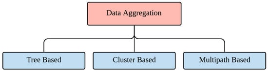 - Data aggregation: Due to most data’s uniformity in WSNs, data aggregation is important to prevent the transmission of similar packets through the network. Most data aggregation methods are signal processing-based; in WSNs, a standard data aggregation method combines all the incoming packets into one output packet [40]. All nodes must transmit their data to the BS in flat architectures via either a direct approach or a multi-hop one; however, some data aggregation methods can only be used in flat architectures that use data-centric applications [41]. Clustering allows data aggregation in the CHs, improving energy efficiency by reducing the total network load.