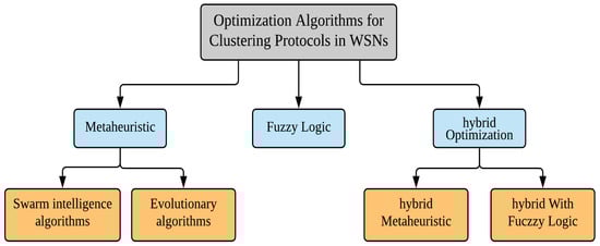 This study also focuses on clustering protocols in WSNs from the perspective of optimization algorithms. Recent studies on optimized clustering solutions were extensively reviewed and examined in detail for protocols regarding the methodology and properties of the considered algorithms. These techniques were evaluated based on the clustering standard parameters and optimization process parameters used with respect to their compatibility with different network characteristics in order to compare cluster protocols. Optimization parameters were used in this review for a better evaluation of the techniques and a general understanding of the clustering protocols. The parameters are presented considering various classes of optimization techniques, such as meta-heuristic, fuzzy and hybrid algorithms. The following are our major contributions: