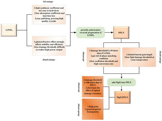 The optical parametric oscillators of lithium niobate crystals can be divided into pure lithium niobate (LiNiO3), periodically poled lithium niobate (PPLN) and periodically polarized lithium niobate doped with MgO (MgO-doped PPLN) optical parametric oscillators based on different crystals. The specific evolution process is shown in Figure 2. In order to improve the damage threshold and stability of the crystal, PPLN is used instead of the traditional LiNiO3 crystal. While in order to further improve the damage threshold of the PPLN crystal, MgO-doped PPLN crystal was born.