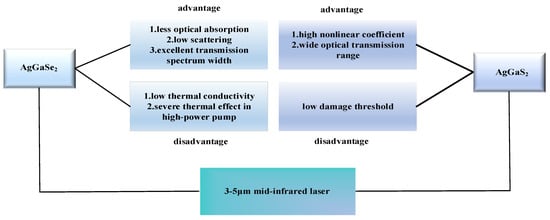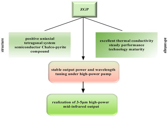 The nonlinear crystals mentioned above have transmittance in the mid-infrared of 3–5 μm, which are currently widely studied in the world. Compared with LiNiO3 and PPLN, MgO-doped PPLN crystal owns a larger damage threshold, and now it has become a research hotspot. However, the thermal conductivity of KTP, AgGaSe2 and AgGaS2 are relatively small, which will induce serious thermal effect under high-power operation and even cause the damage of crystals. Therefore, the output and applications of high-power mid-infrared in the future are limited. The thermal conductivity is smallest, and the damage threshold is the highest of ZGP crystal, which may be the reason why the output power is largest among these nonlinear crystals. It has a compact laser structure, the advantages of a wide tuning range of output wavelength and so on. Therefore, it can be said that the realization of mid-infrared laser output based on ZGP crystal is mainstream through an indirect way.