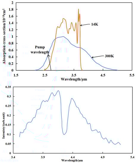 The absorption peak of Fe: ZnSe crystal is near 3 μm at room temperature. Additionally, the emission peak is near 4.3 μm. Take note that the absorption characteristics of Fe: ZnSe crystal varies greatly with temperature, as shown in Figure 9. The absorption cross sections of Fe: ZnSe crystal are greatly at 14 K. Additionally, the absorption cross section will become lower while, at the same time, the absorption range will become wider at 300 K. From the emission spectrum of Fe: ZnSe, the material emission spectrum range is 3–5 μm [].